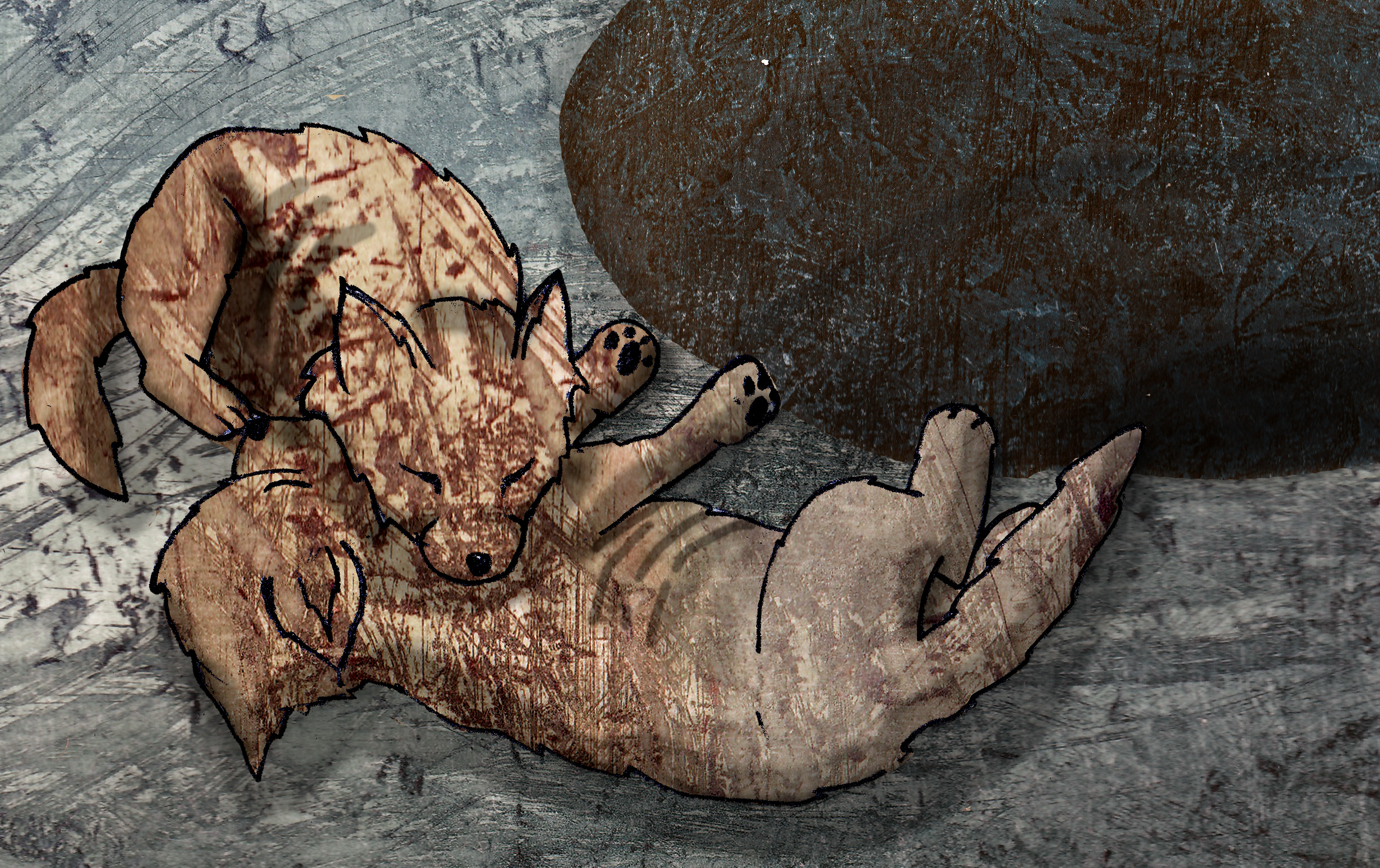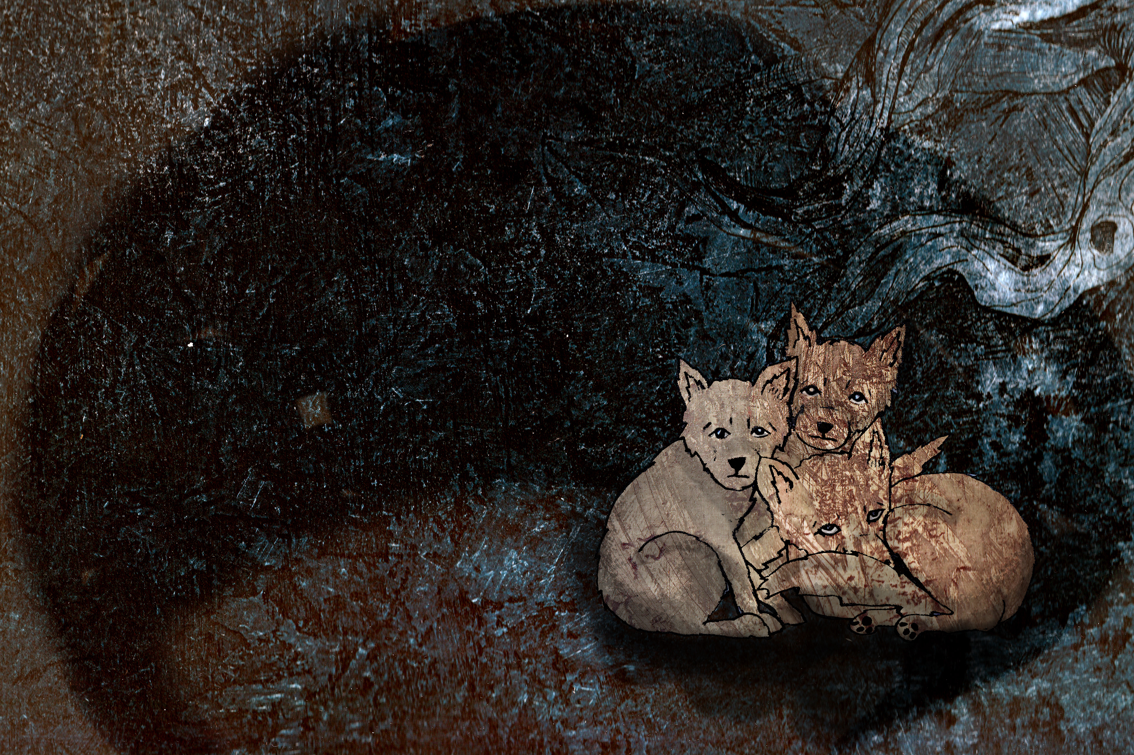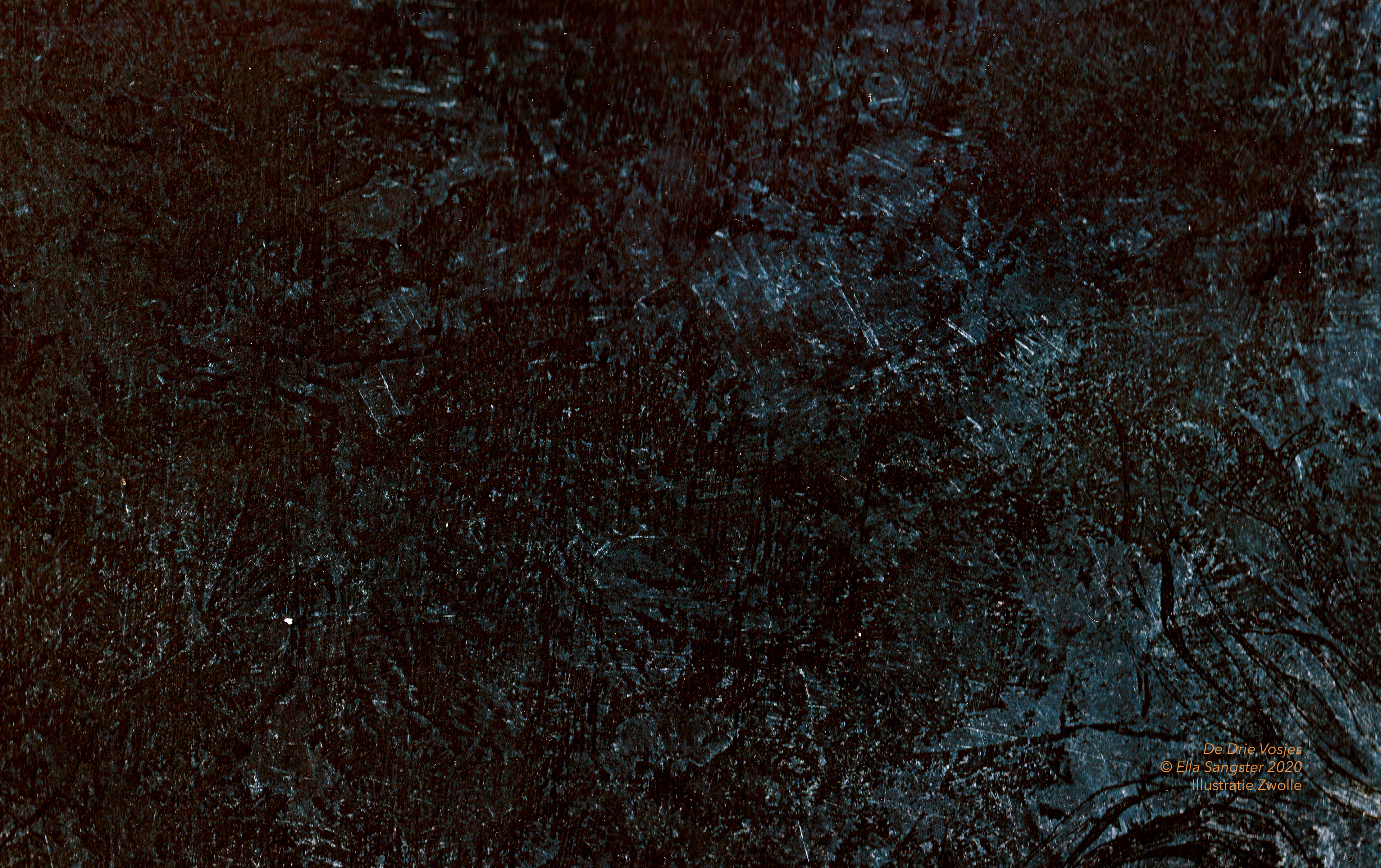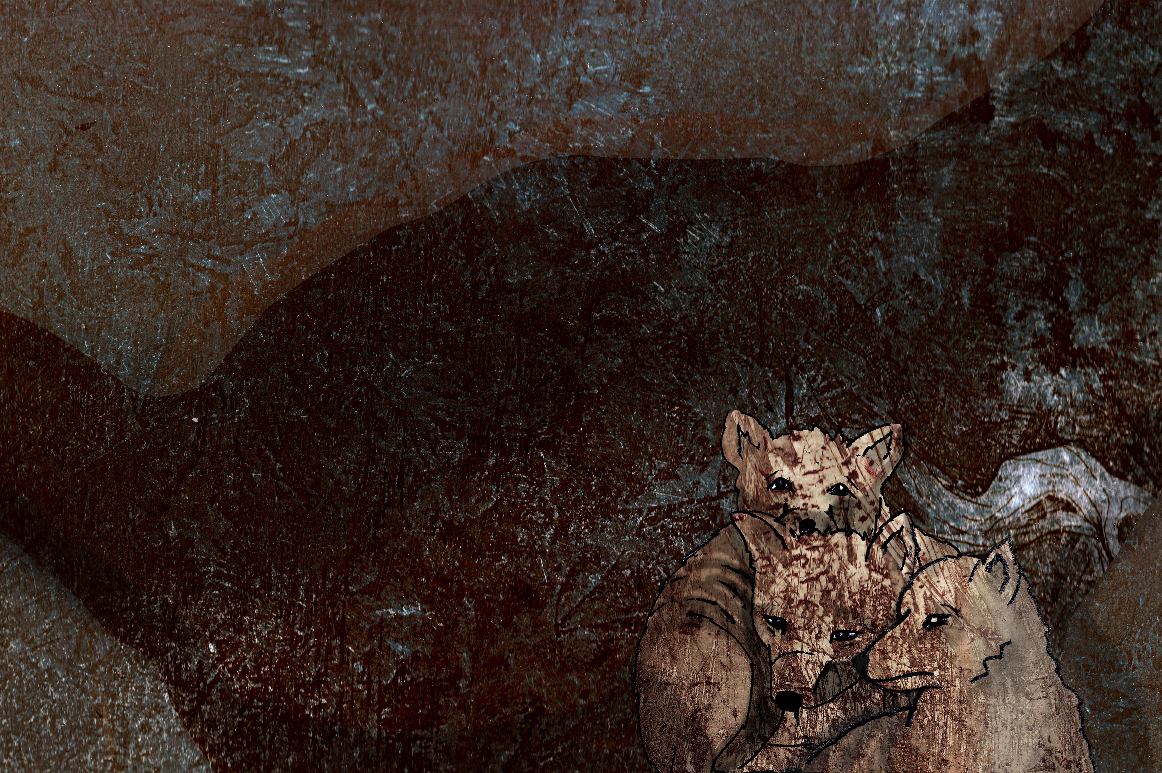 'The Three Foxes' is based on a real story. My family and I found a little fox next to a fox den. We tried to save him/her and it's two brothers/sisters. But nog everything will always work out the way you want it to... I made digital collages with etching textures and pencil drawings.