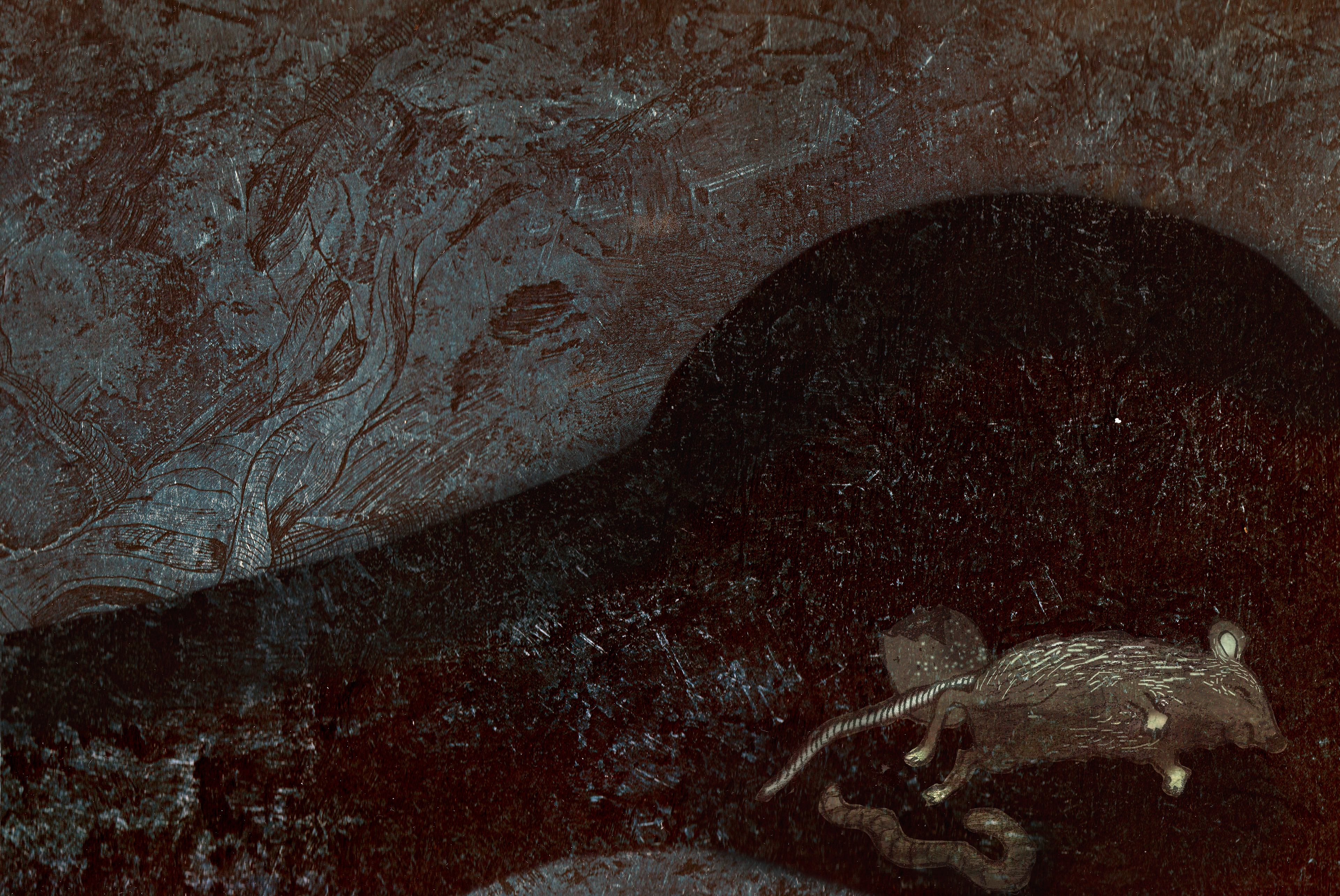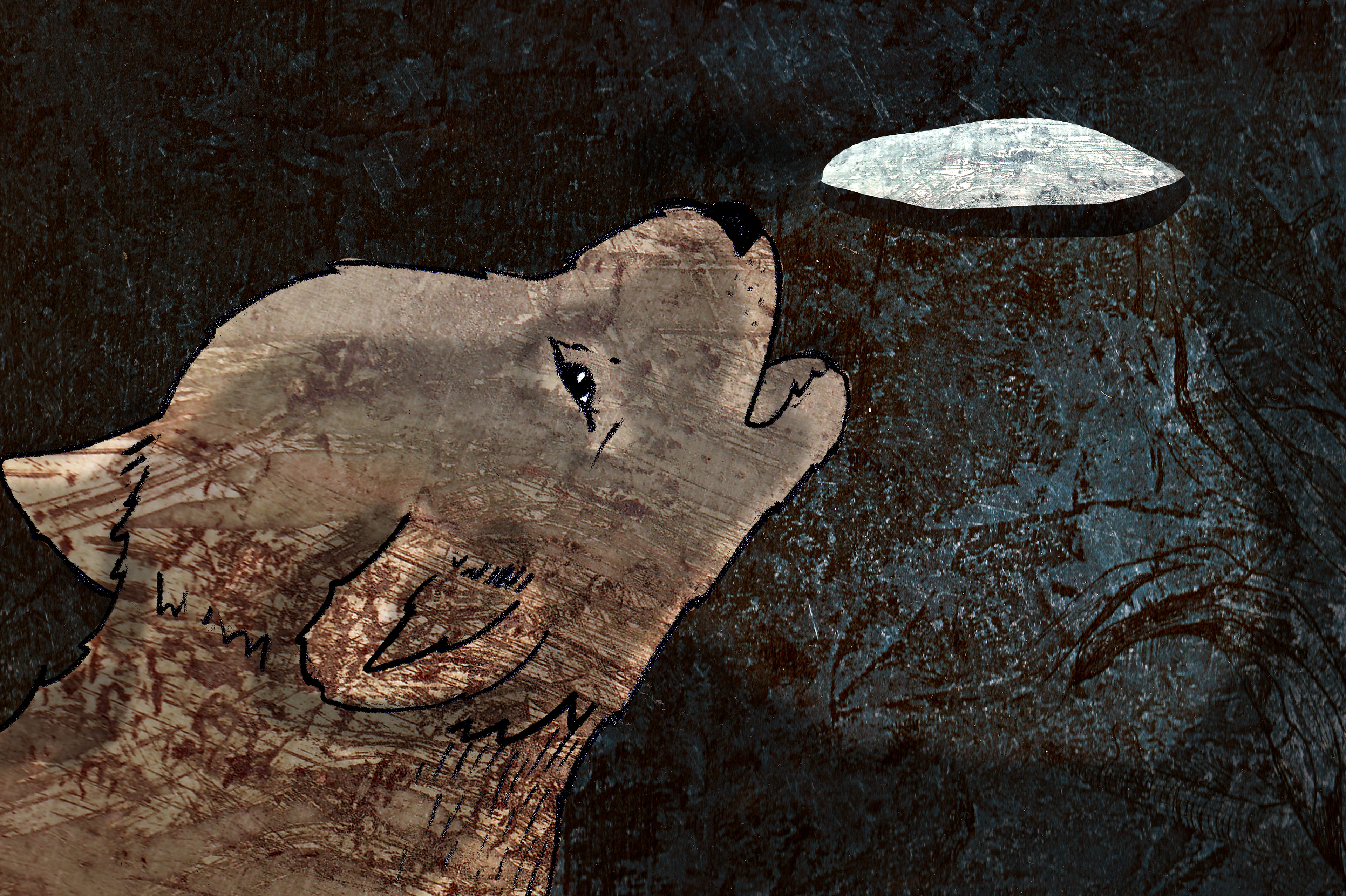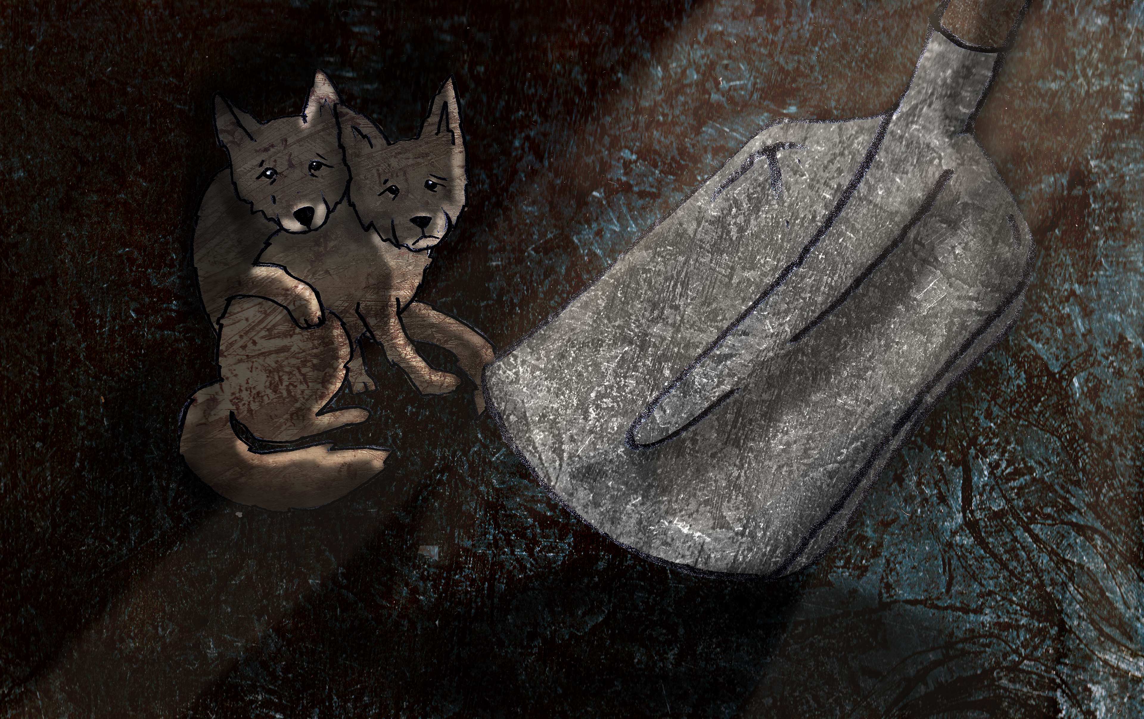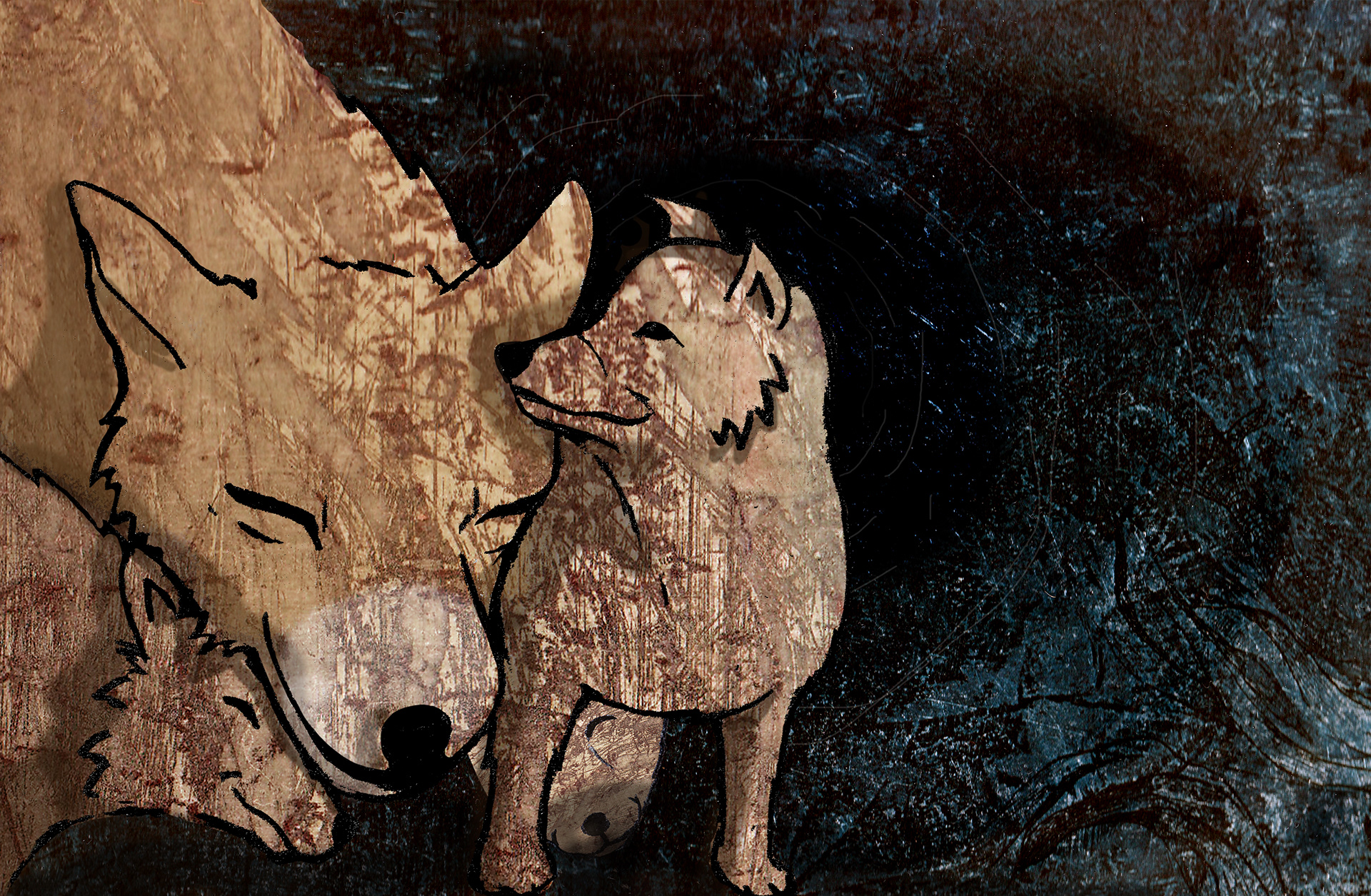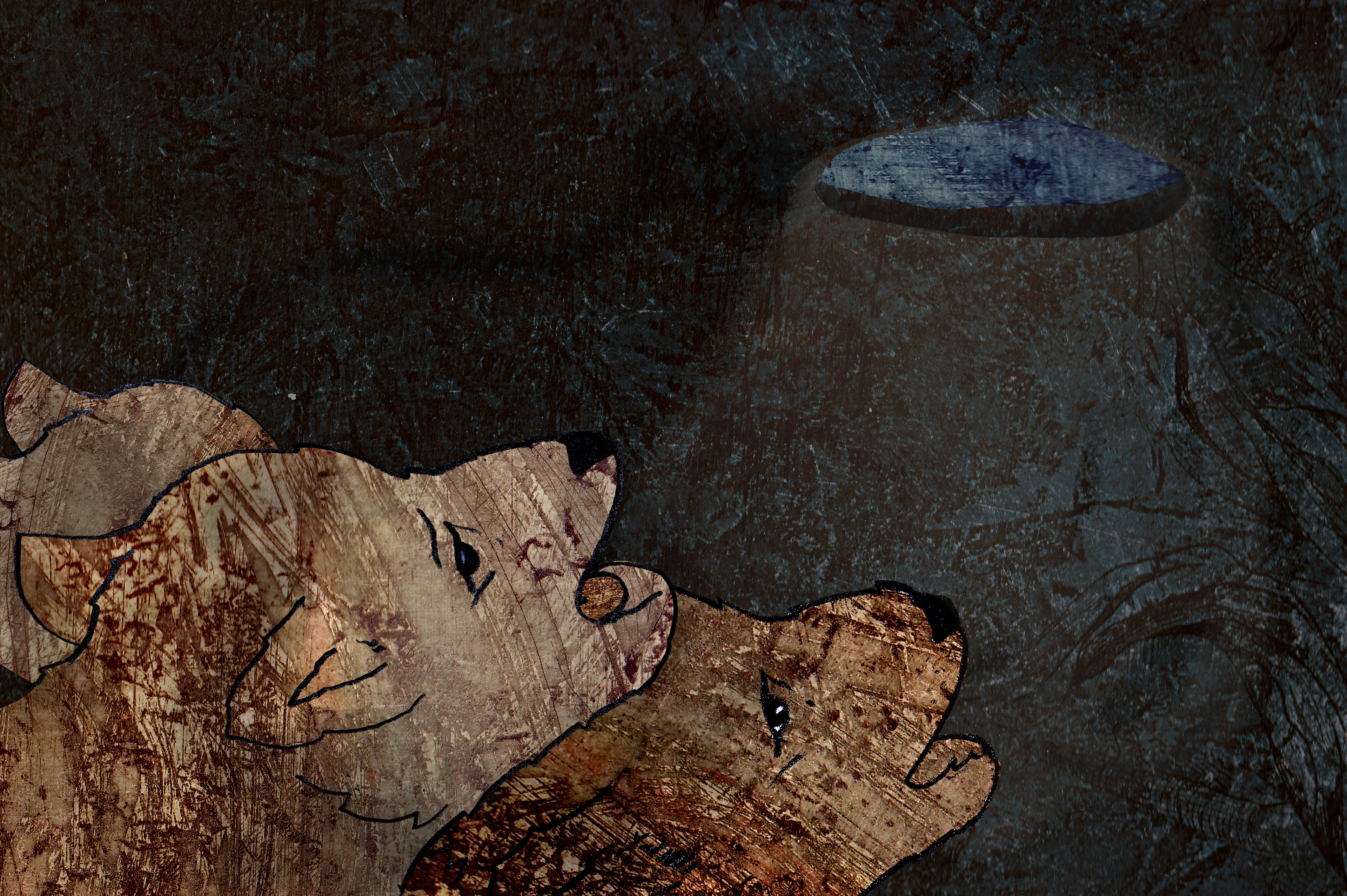 'The Three Foxes' is based on a real story. My family and I found a little fox next to a fox den. We tried to save him/her and it's two brothers/sisters. But nog everything will always work out the way you want it to... I made digital collages with etching textures and pencil drawings.